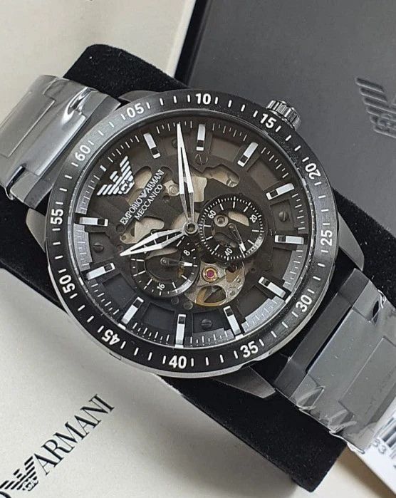 The Emporio Armani AR60054 Mario is a masterpiece of elegance and precision. Its striking glass case and open-frame dial reveal the intricate automatic movement, offering a captivating view from both the front and back. Crafted from premium stainless steel, the case and bracelet exude durability and refinement, while the unique dial design features chronograph details for added sophistication. It combines style, craftsmanship, and functionality—perfect for the modern gentleman.
